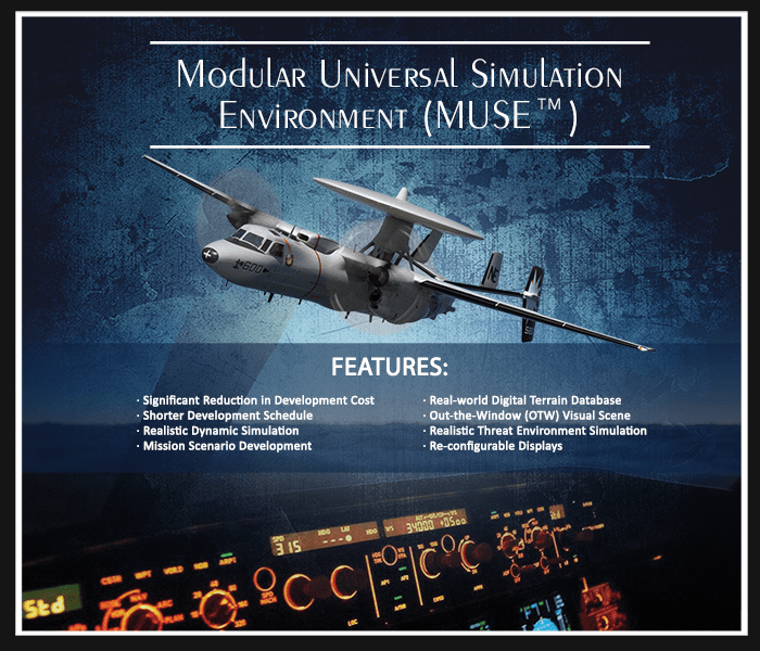 O MUSE ™ é um ambiente único de desenvolvimento de simuladores e simulação em tempo real. O MUSE ™ é projetado especificamente para facilitar a reutilização do código do cliente para modelagem de plataformas comuns ou sistemas de missão em veículos aéreos (asa fixa ou rotativa/UAV), veículos terrestres e embarcações marítimas.